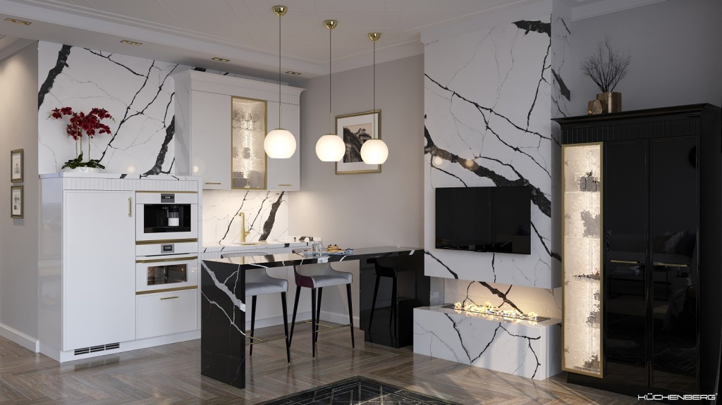 Несмотря на то, что кухни с барной стойкой чаще всего применяются в помещениях, выполненных в современном стиле, в классическом они также уместны. В облик последних в таком случае они привносят элементы современного образа жизни.